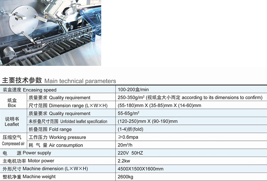 本產品是我公司結合國外裝盒機的先進技術及根據國內制藥行業的實際情況而研發的擁有新型、具有先進的高速多功能自動裝盒機,是機、電、氣光一體化的高科技產品。本產品適用于鋁塑藥板、瓶、口服液、鋁/塑管、面膜、及各類電子、日用品等以及相類似物品的裝盒包裝,具有自動完成使用說明書的折疊、紙盒自動打開、物品裝盒、打印批號、封盒等功能。該機可以單獨使用亦可以與其他設備聯動使用,形成聯動生產線。
